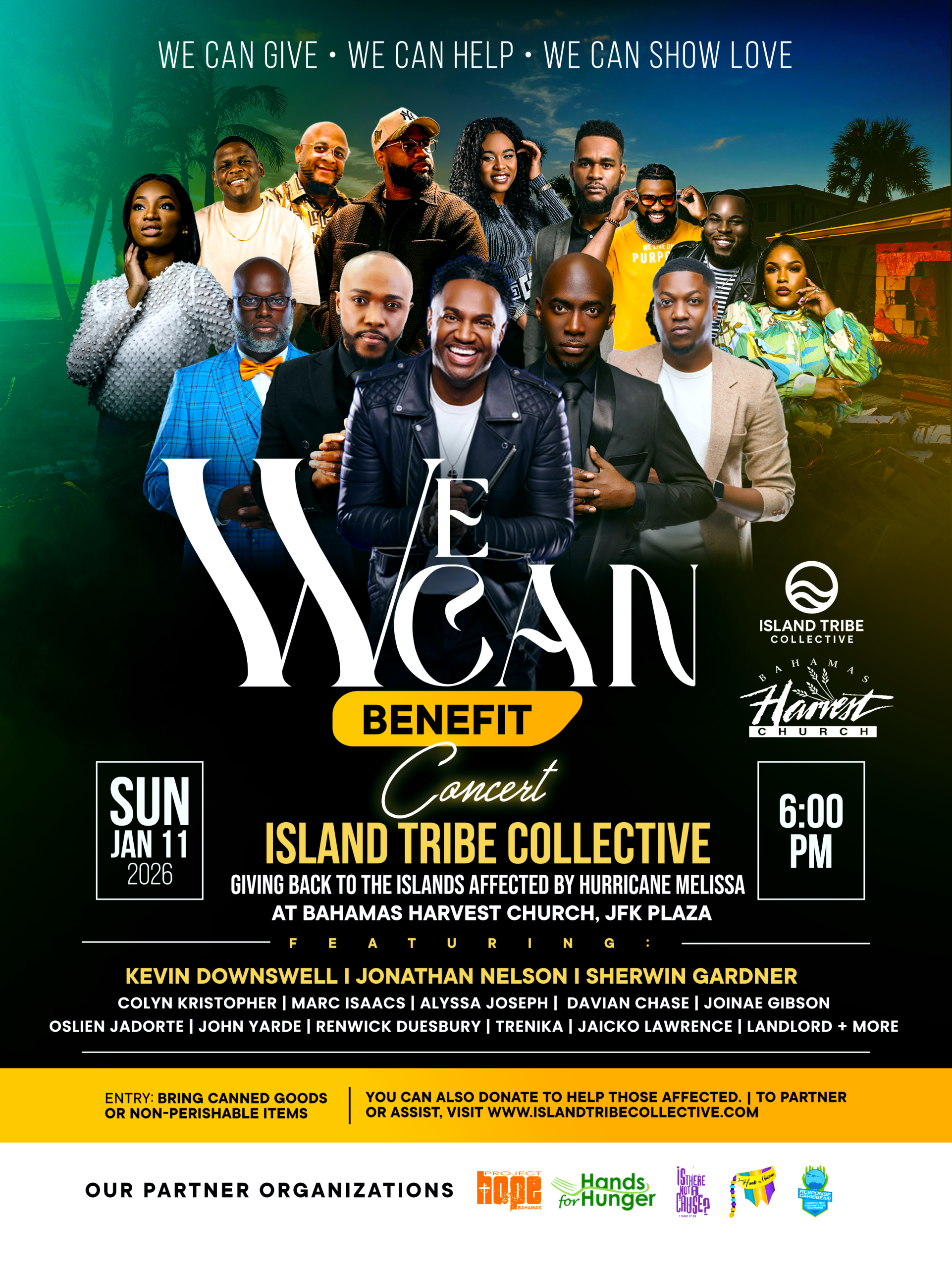 The Island Tribe Collective presents the We Can Benefit Concert — a free community event dedicated to supporting families affected by Hurricane Melissa across Jamaica, The Bahamas, and the Caribbean. Join top regional artists for an uplifting night of worship, unity, and hope. Featuring: Sherwin Gardner, Colyn Kristopher, Kevin Downswell, Marc Isaacs, Alyssa Joseph, Oslien Jadorte, John Yarde, Renwick Duesbury, Trenika, Jaicko Lawrence & more. How to Support: Bring canned goods or non-perishable items for entry, or donate anytime at www.islandtribecollective.com .